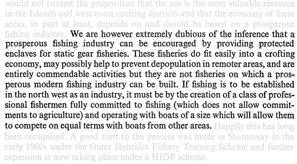 The industry on the east coast was built up under the protection of the prohibitions on trawling and seining within the 3 mile limit and of permissive byelaws, which in effect gave local small boat fishermen such priority. It would be a mistake, and unjust, to remove this protection from the north west coast just when, for the first time for many decades, there is a real possibility, which is being fostered by the Government and the [Highlands and Islands Development Board] of an expansion of locally-based fishing.